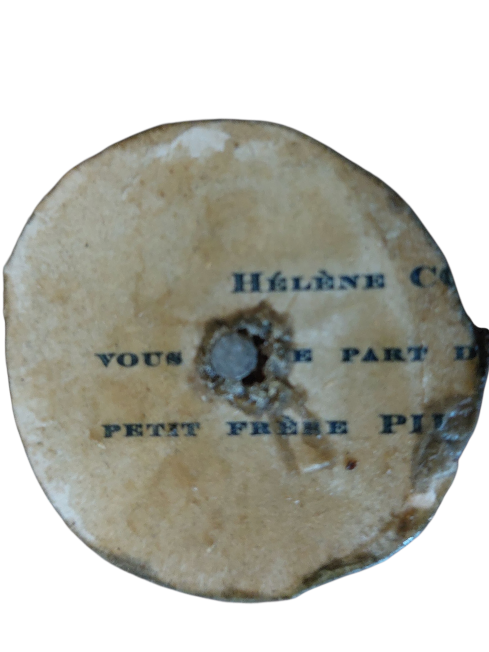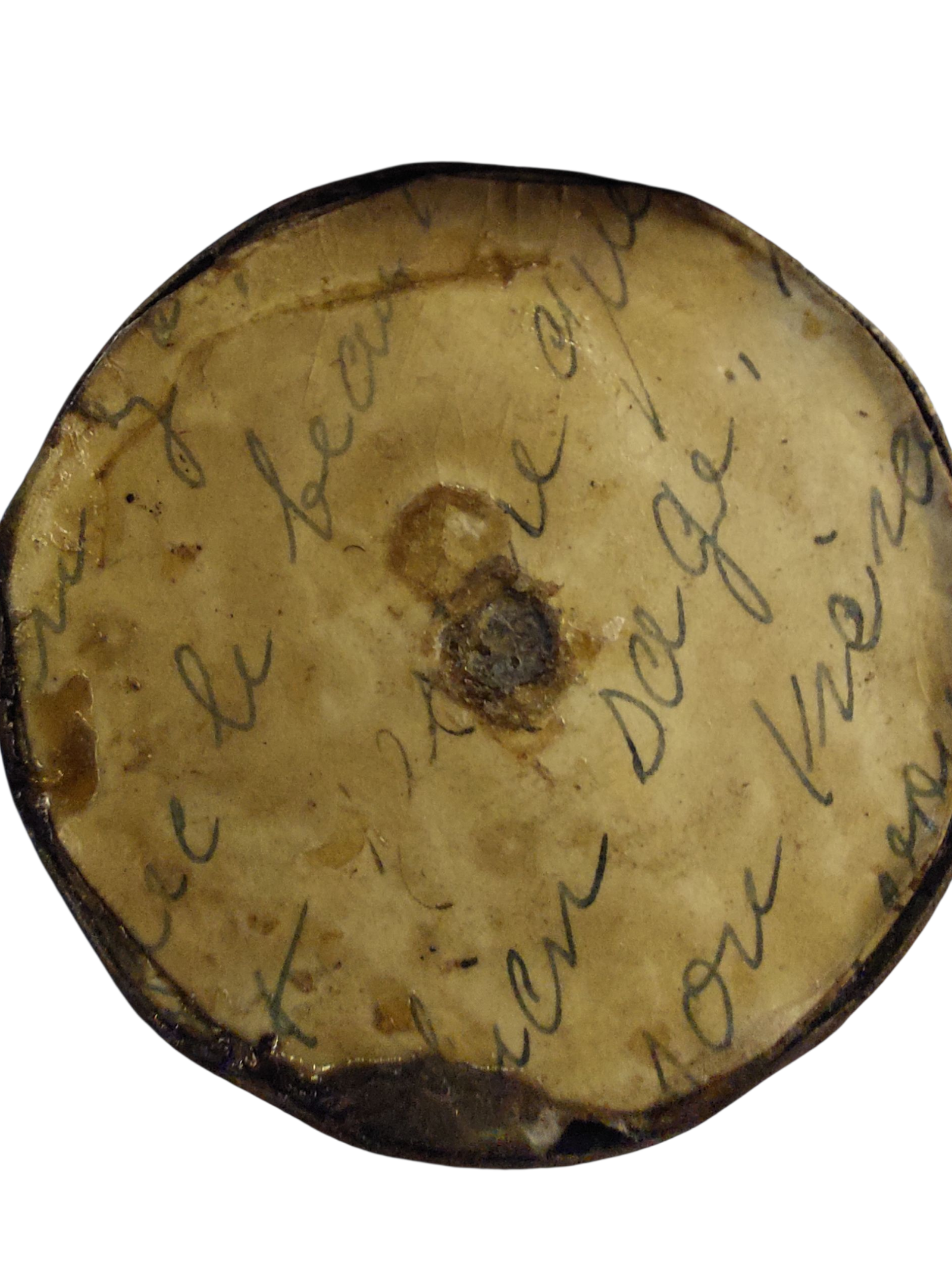 Le revers de l’icône révèle un papier manuscrit ancien, probablement contemporain de l’objet, portant les traces d’une prière, d’une invocation ou d’une dédicace personnelle. L’écriture, aujourd’hui partiellement altérée par le temps, atteste d’un usage réel et prolongé, renforçant la dimension profondément humaine et spirituelle de cet artefact.