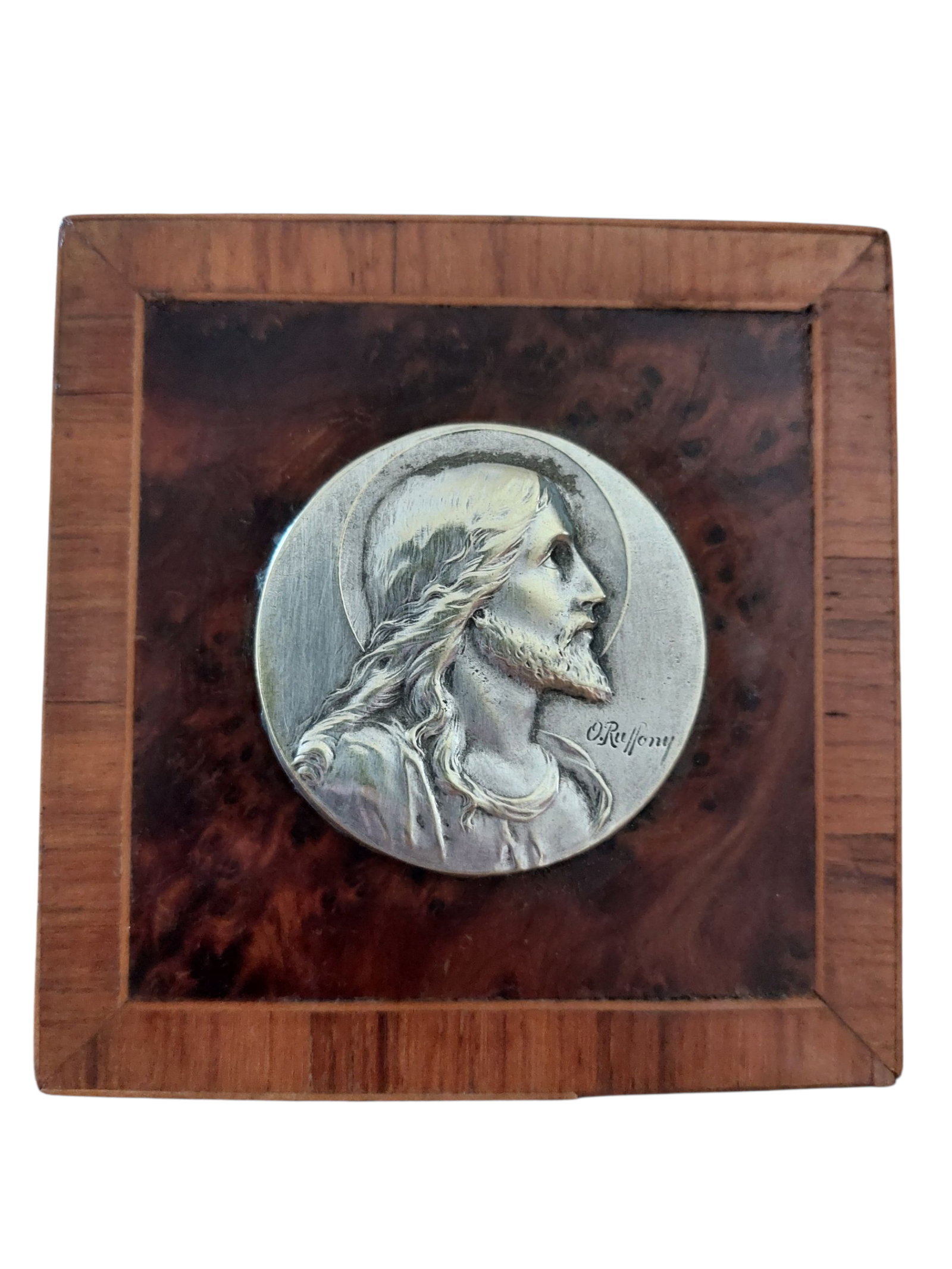 À la charnière des XIXᵉ et XXᵉ siècles, ce type d’objet était couramment utilisé comme support de prière privée et de protection spirituelle, placé dans un intérieur pour bénir un lieu, accompagner un foyer ou servir de rempart symbolique contre les influences jugées néfastes. Le visage du Christ, finement travaillé, incarne la présence protectrice et rédemptrice propre aux représentations chrétiennes de cette époque.