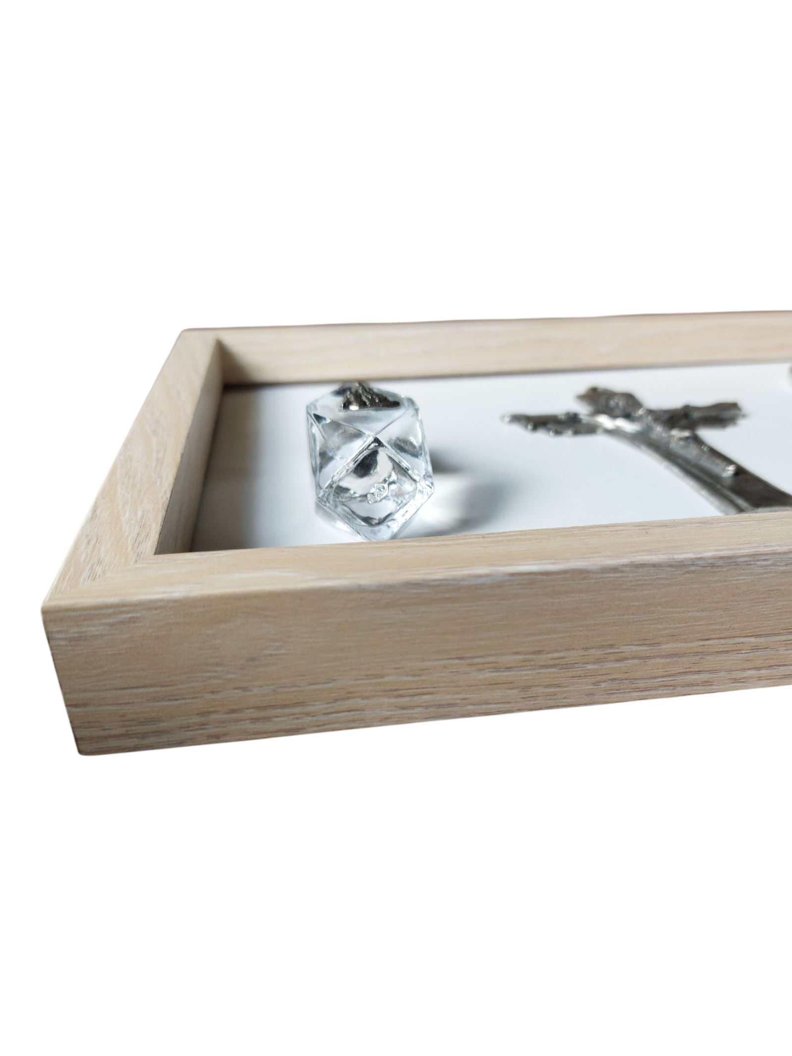 Présenté dans un cadre en bois clair, volontairement sobre afin de mettre en valeur les éléments qu’il renferme, ce reliquaire rassemble plusieurs objets à forte charge symbolique :