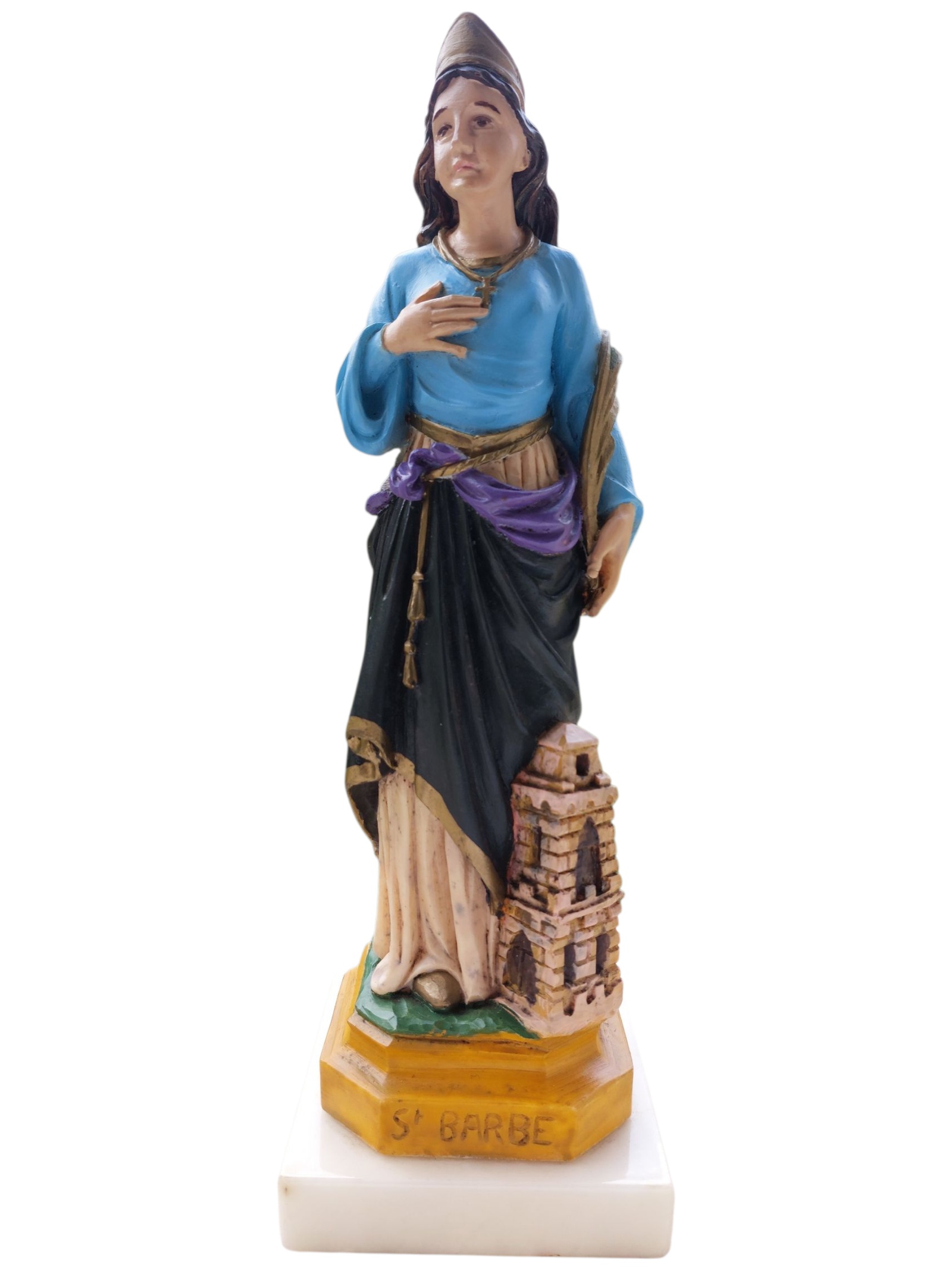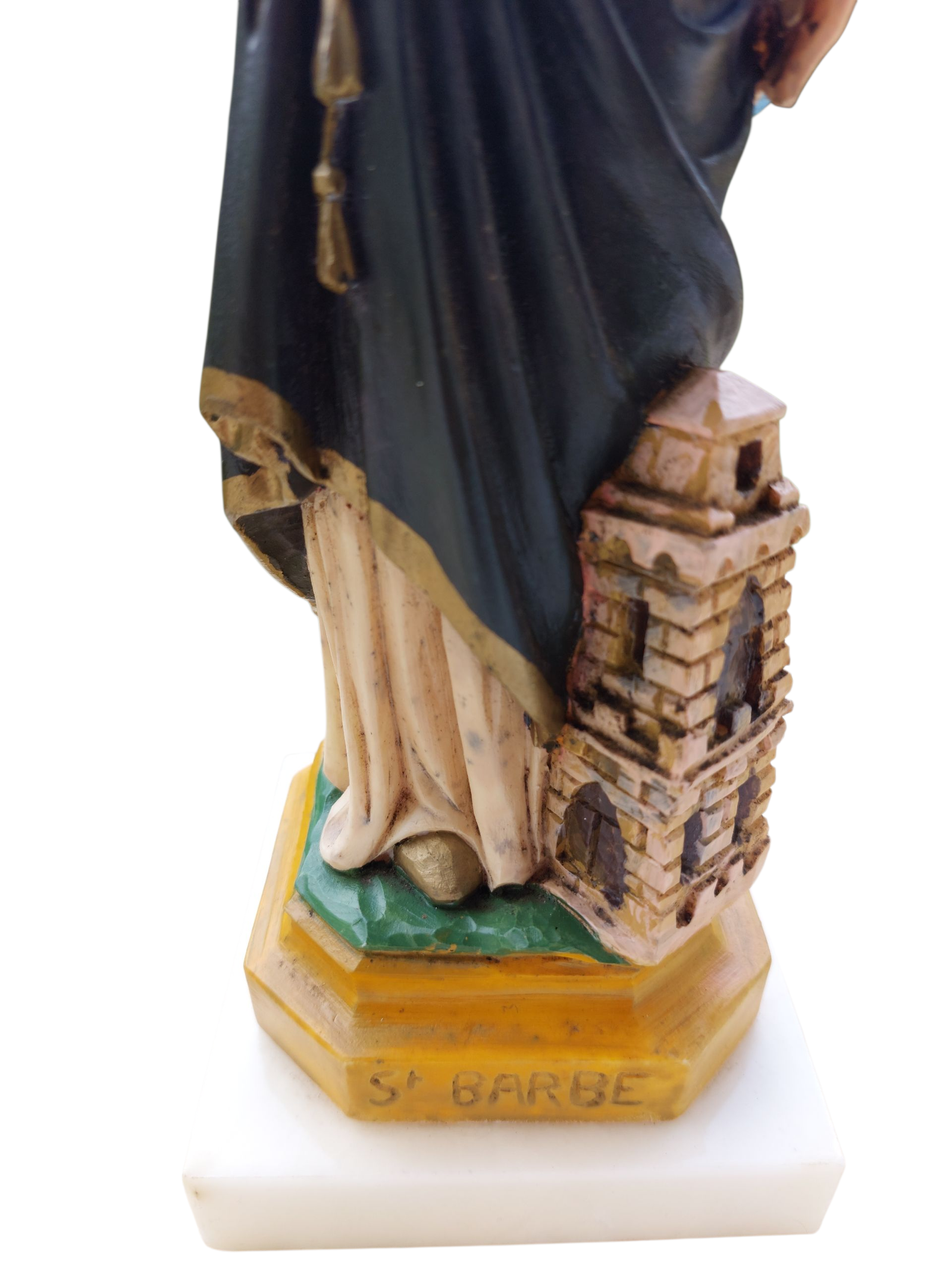 Réalisée en plâtre polychrome, elle repose sur un socle octogonal, portant clairement l’inscription Sᵗᵉ BARBE. La sainte est représentée selon son iconographie classique : vêtue d’une robe sombre et d’un manteau bleu, tenant un livre, et accompagnée de la tour, symbole de son emprisonnement et de sa foi inébranlable.
