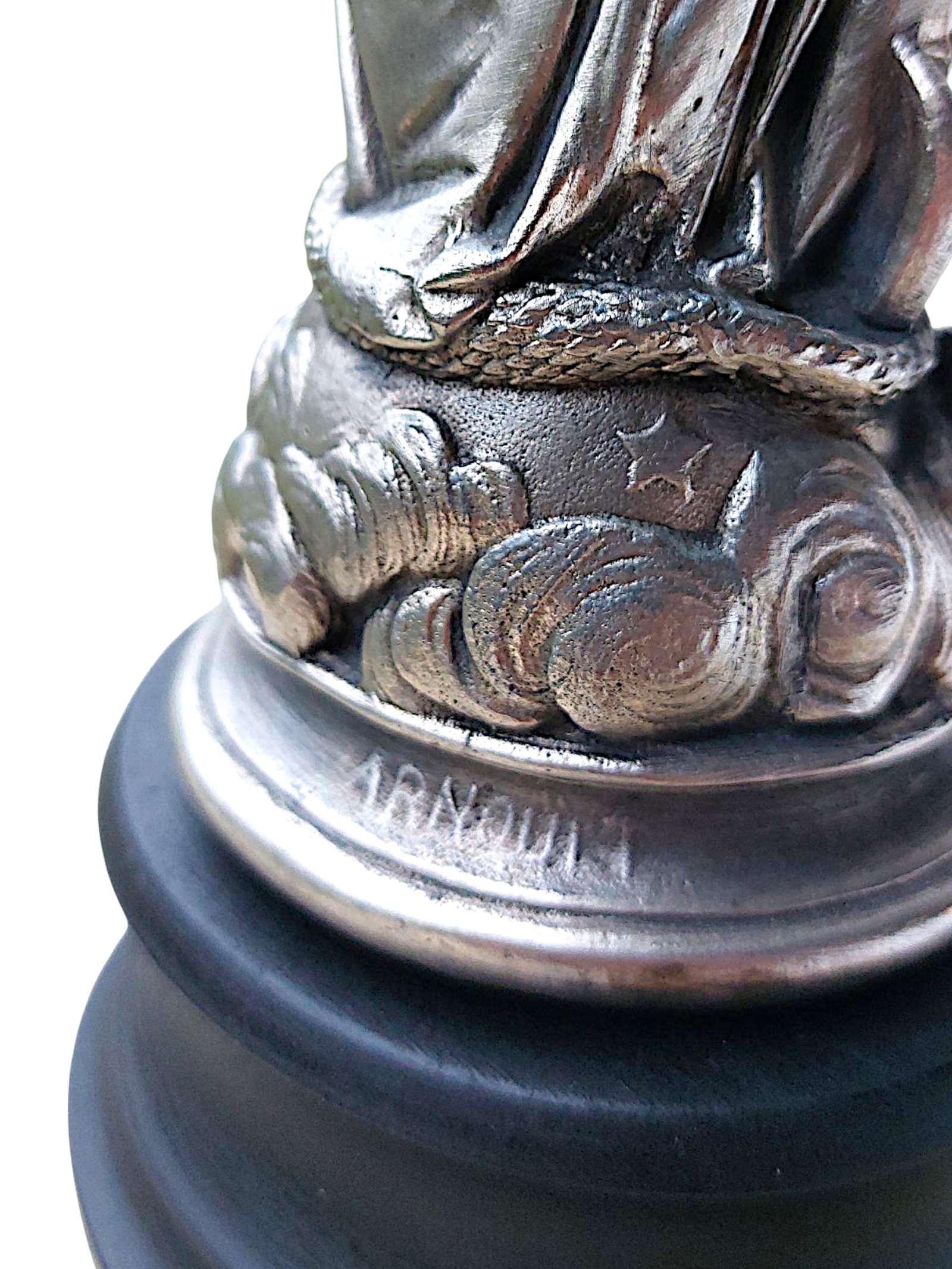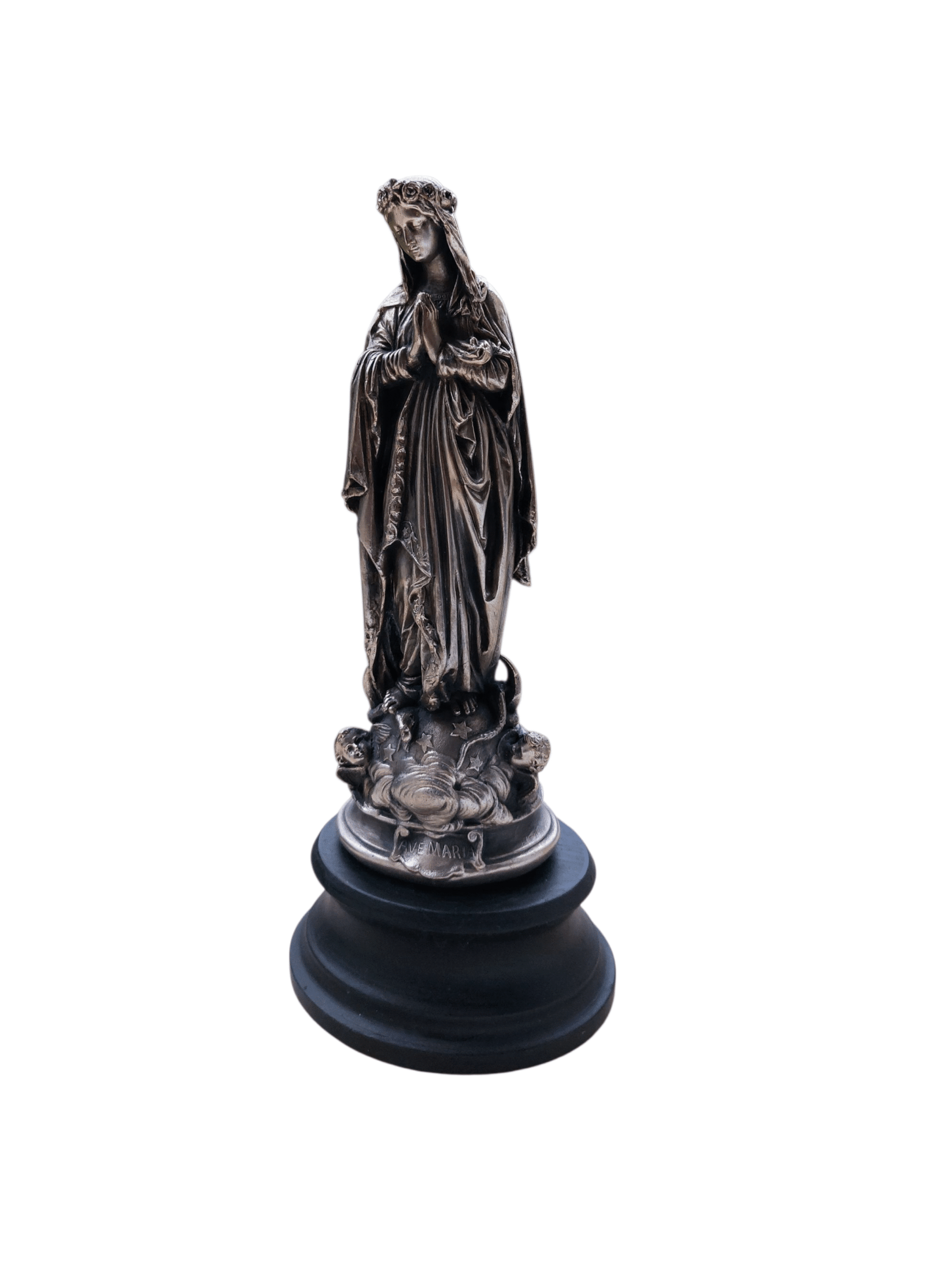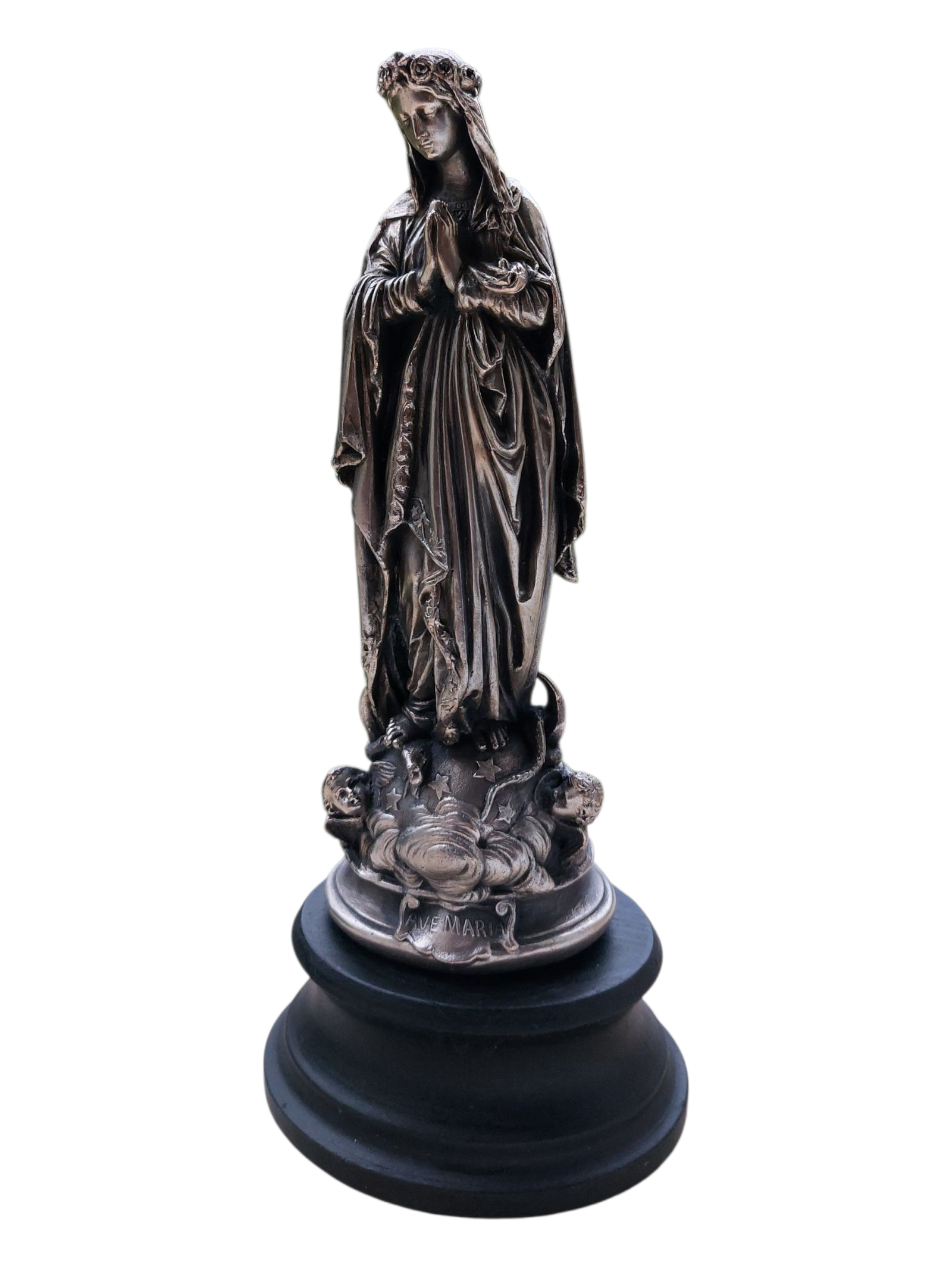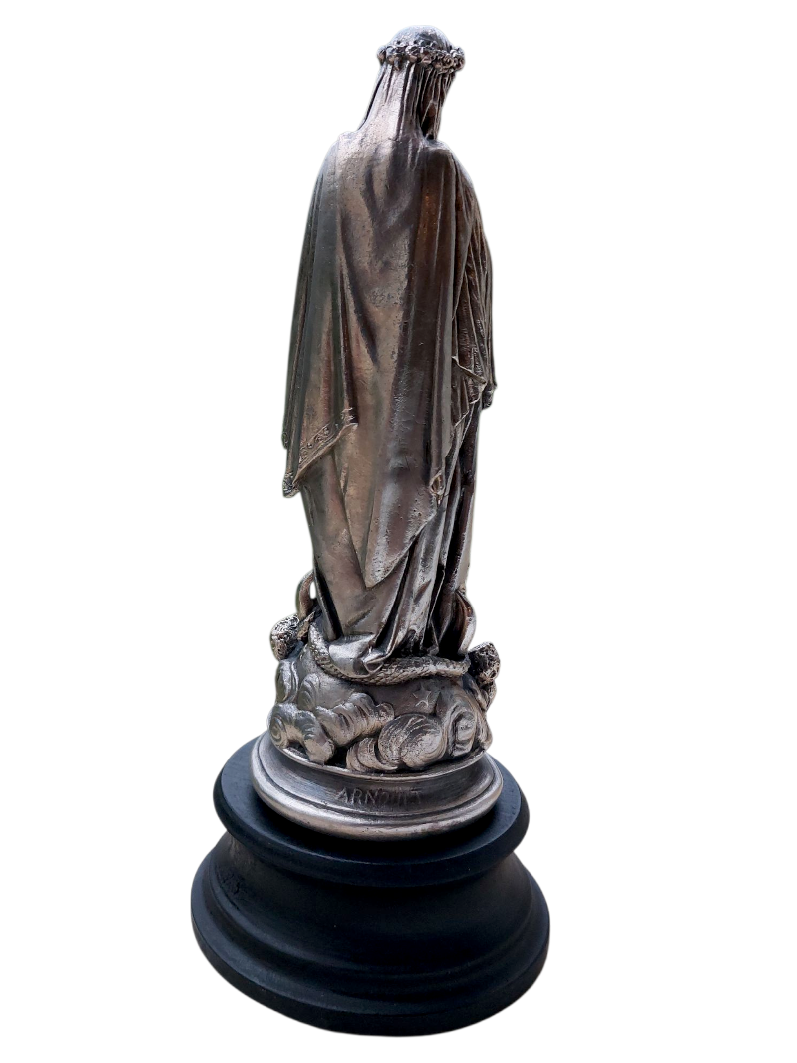 Élégante statuette ancienne de la Vierge Marie en métal patiné (régule revalorisé), cette pièce rare incarne la dévotion et la sérénité. Réalisée au XIXe / début XXe siècle, elle porte en elle toute la mémoire et l’authenticité d’un objet sacré transmis à travers le temps. Son socle en bois noir met en valeur les détails minutieux de la sculpture, depuis la couronne de roses jusqu’aux angelots et à l’inscription « Ave Maria ». Authentique et chargée d’histoire, elle porte également la mention ARNOUX, gage de savoir-faire artisanal. Plus qu’un simple objet décoratif, elle symbolise la protection, la pureté et la spiritualité, et séduira autant les collectionneurs que les passionnés d’art religieux.
