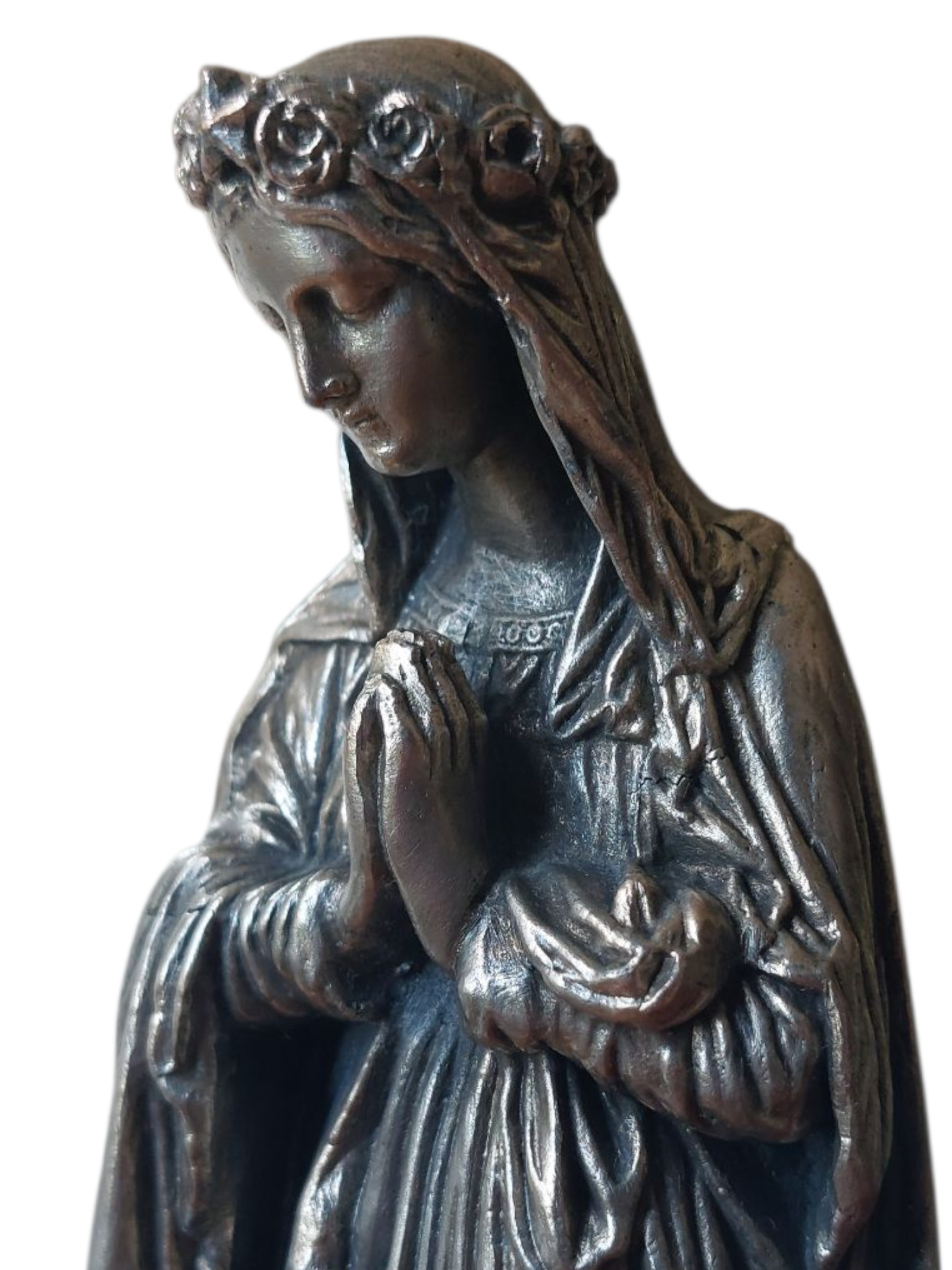 Plongez dans la richesse du sacré avec cette statuette ancienne de la Vierge Marie en métal patiné, une pièce rare et authentique qui allie spiritualité et artisanat. Représentée dans une posture de prière, les mains jointes et le regard empreint de sérénité, la Vierge est finement sculptée et ornée d’une couronne de roses, symbole de pureté et de grâce.