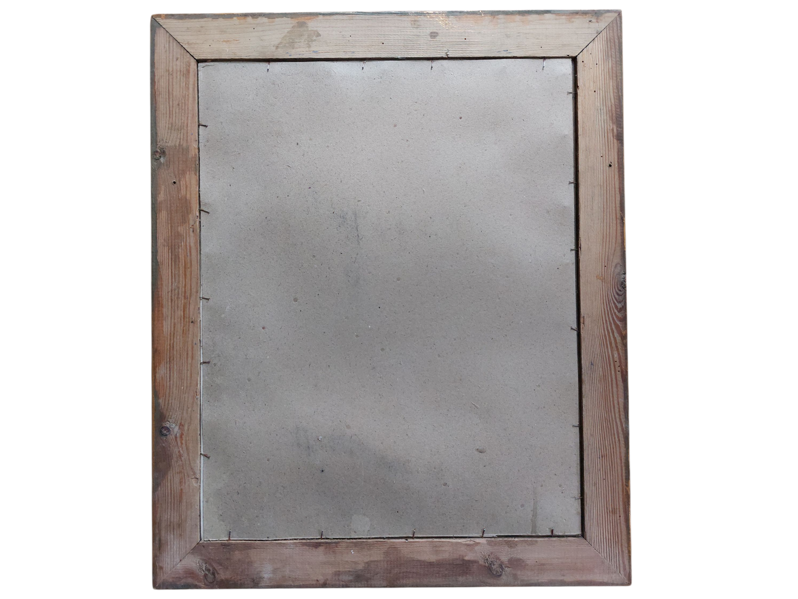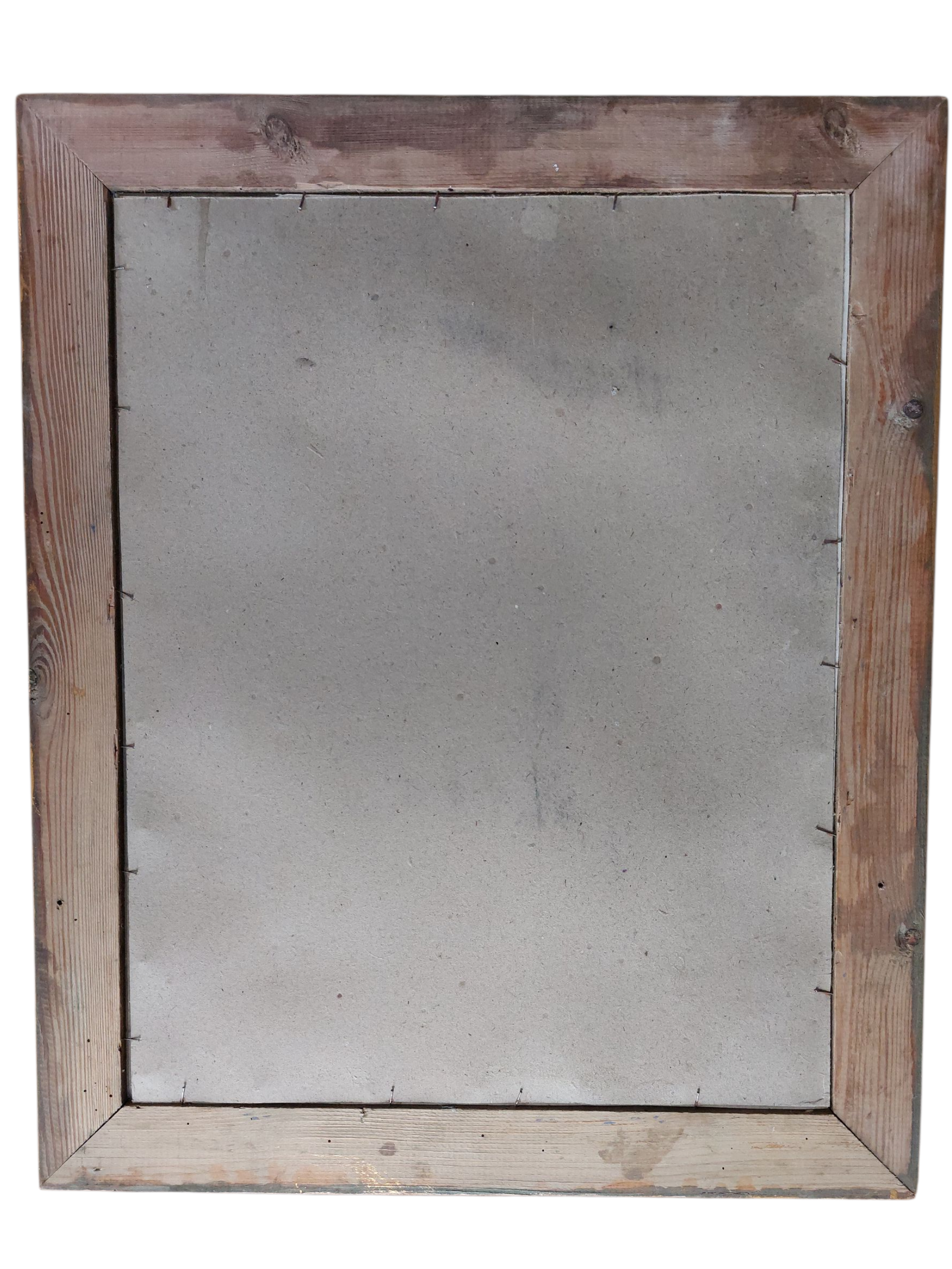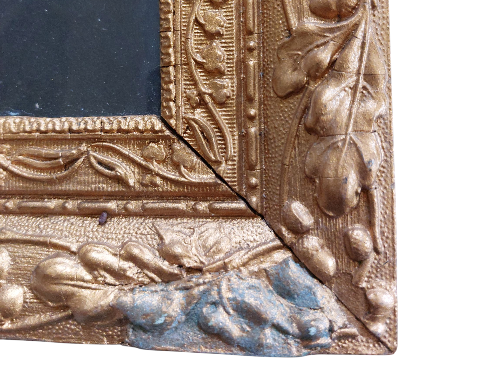 L’image est présentée dans un cadre ancien en bois et stuc doré, richement mouluré de motifs végétaux. Les marques du temps visibles sur la dorure et les angles — usures, manques ponctuels, patine — témoignent de son ancienneté authentique et de son usage réel. Le dos du cadre, maintenu par de petits clous, est typique des encadrements de la fin du XIXᵉ siècle.