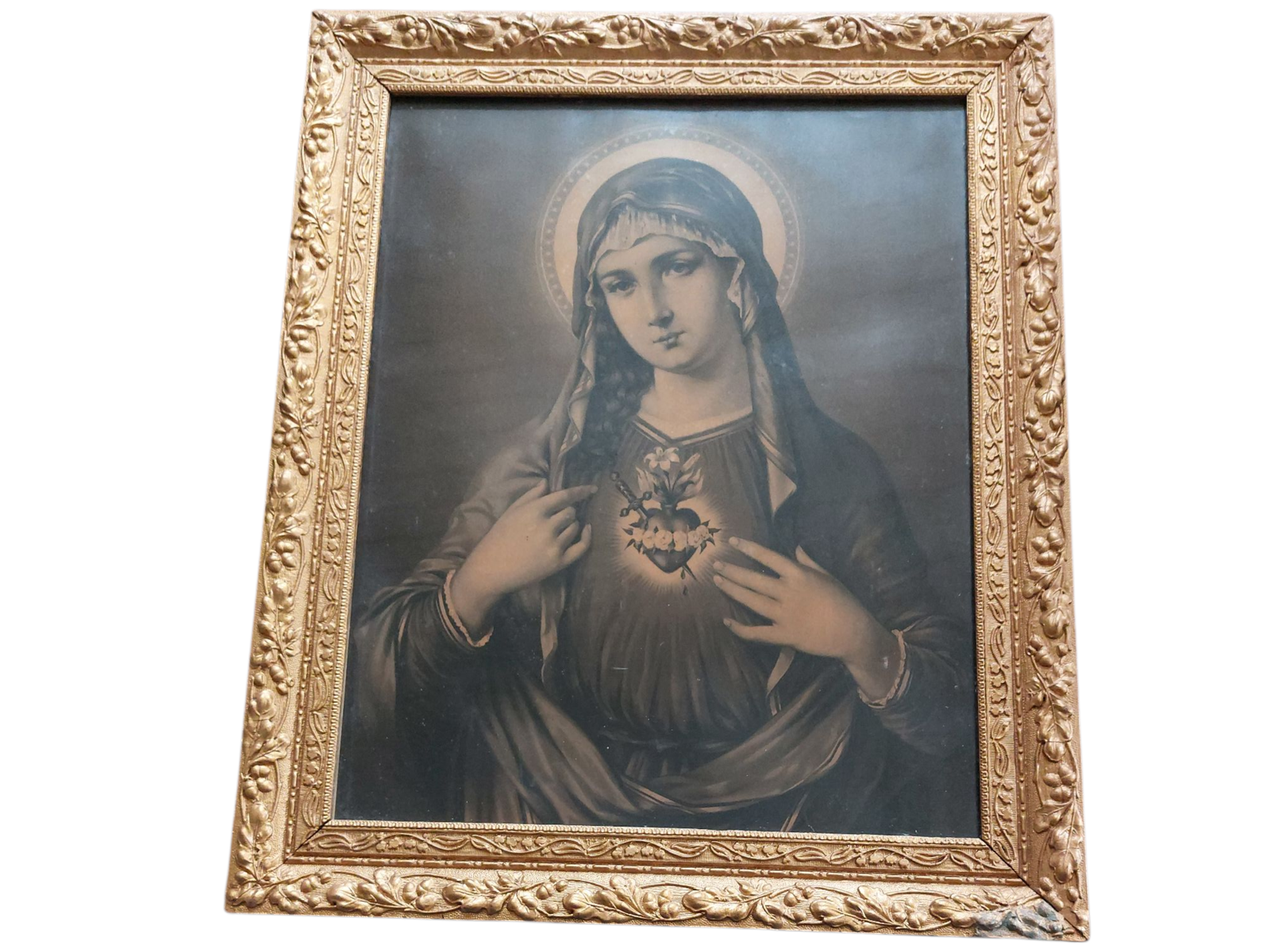 Ce tableau ancien de la Vierge au Sacré-Cœur est un objet de dévotion domestique emblématique de la spiritualité chrétienne de la fin du XIXᵉ siècle ou du début du XXᵉ siècle. Il s’inscrit dans la tradition des images pieuses encadrées, largement diffusées dans les foyers croyants afin d’invoquer protection, réconfort et intercession mariale.